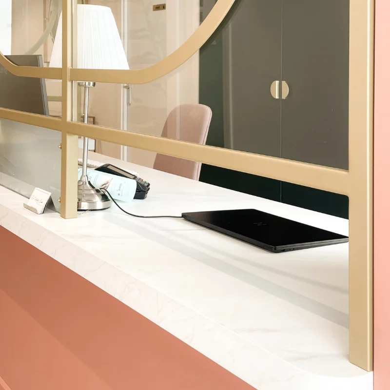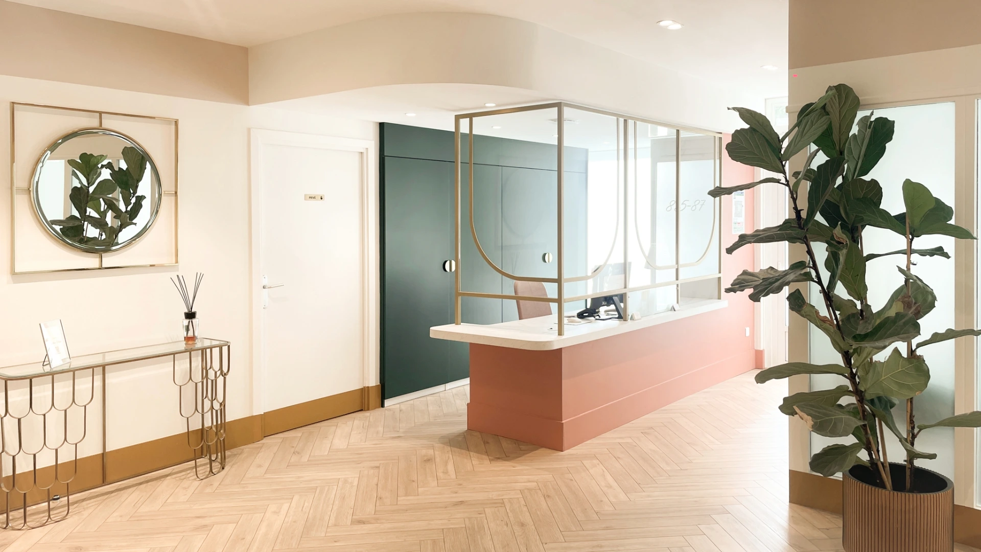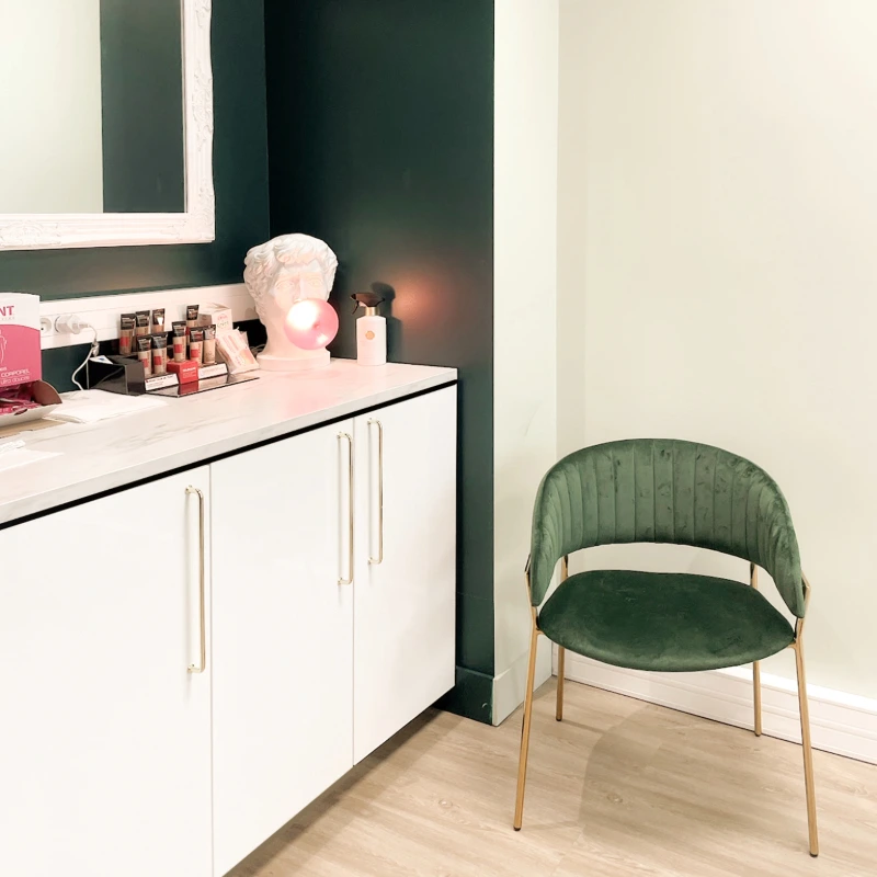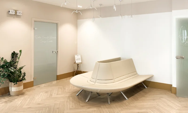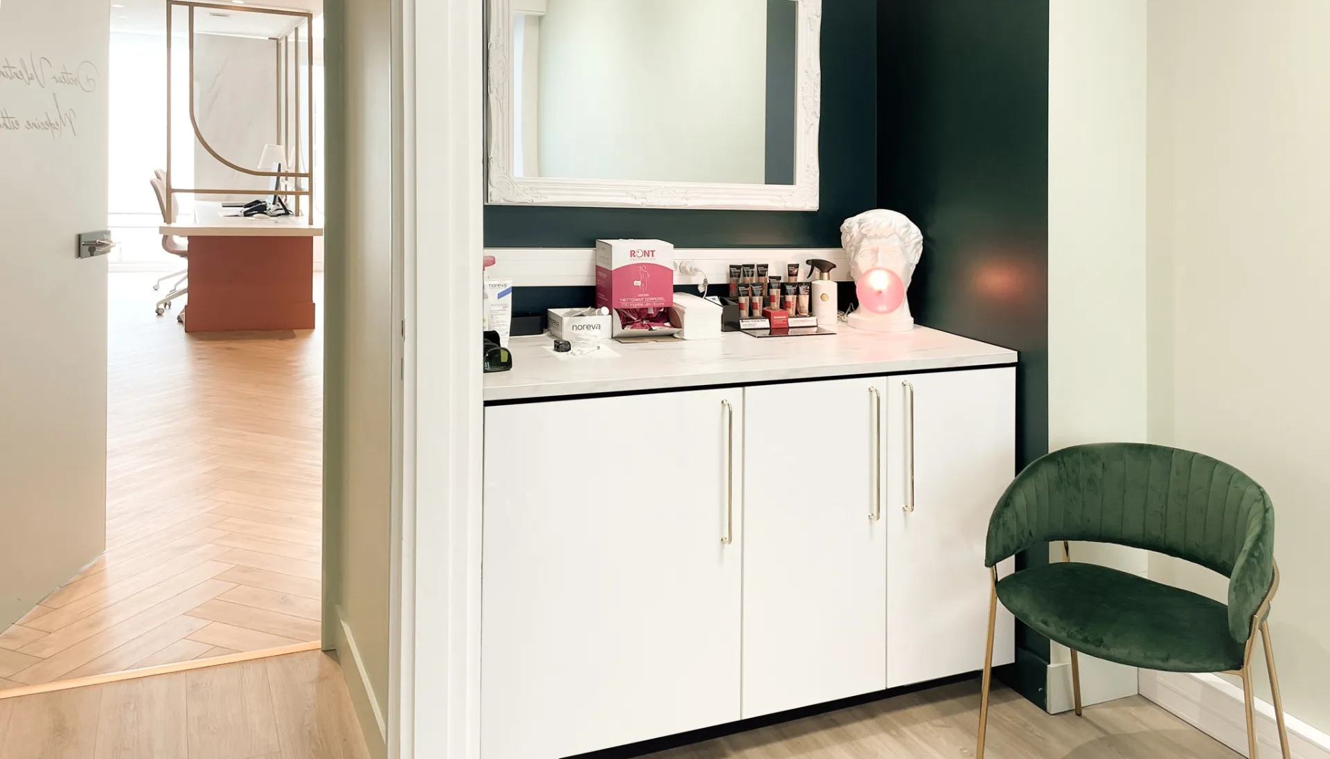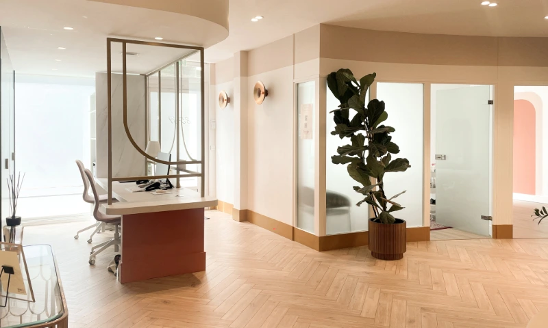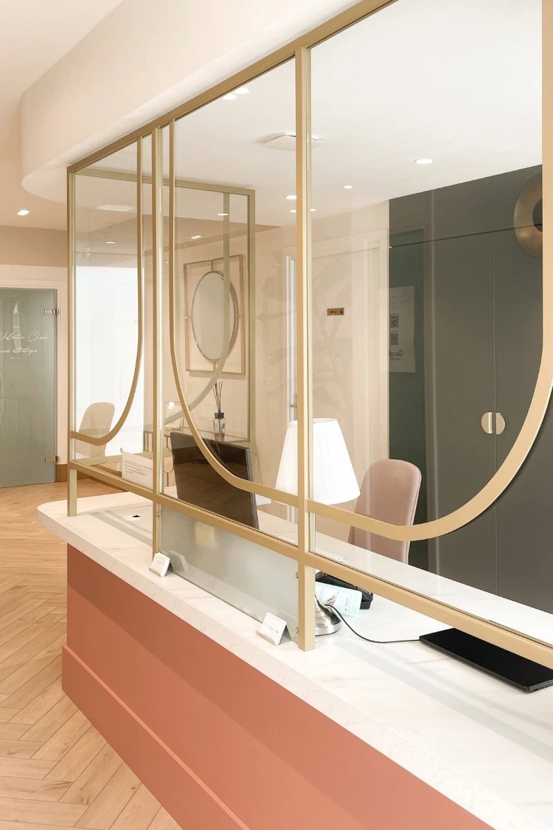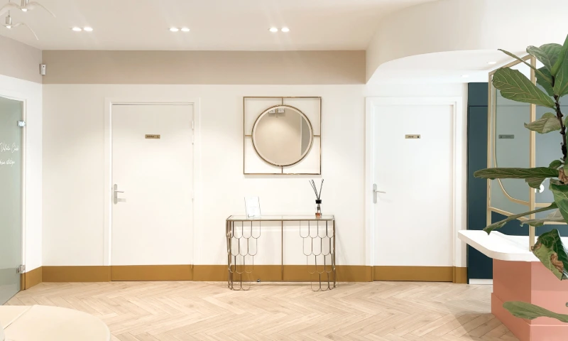 Anciennement à usage de bureau, ce local a été repensé pour accueillir un cabinet de médecine esthétique et un cabinet dentaire. L’enjeu était d’optimiser la distribution des pièces sans tout démolir, afin de limiter les coûts tout en assurant un parcours fluide pour les patients et praticiens, dans le respect des normes propres à ces professions. L’atmosphère initiale, froide et impersonnelle, a laissé place à un cadre chaleureux et raffiné, conçu pour inspirer bien-être et confiance. Dans cet univers où l’image est essentielle, chaque détail a été pensé pour allier esthétisme et fonctionnalité, créant un lieu à la fois élégant et apaisant.